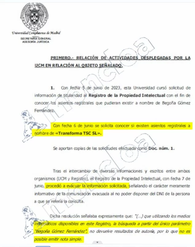 Pero el primer problema al que se enfrenta ahora la codirectora de ese máster, Begoña Gómez, es que puede ser acusada de apropiación indebida, tal y como dejó claro la Audiencia Provincial de Madrid en un auto dictado el pasado 9 de septiembre: «dado que fue precisamente para ese máster para el que se había desarrollado gratuitamente el software del que, según el escrito de querella, se habría apropiado la señora Gómez, ofreciéndolo a través de la mercantil Transformación Social Competitiva (TSC) y habiendo presentado con fecha 10/10/2022 en la Oficina de Patentes y Marcas, solicitud de Marca nacional a título personal para TSC Transforma de medición de impacto social y medioambiental, www.TrasnsformaTSC.org entendemos que prima facie si existe la conexidad apreciada por el titular del Juzgado de Instrucción 48 de Madrid, sin perjuicio de lo que se pueda resolver por el Juzgado (41) a cuyo favor se acuerda inhibición y que sí tiene pleno conocimiento de los hechos sobre los que versa la instrucción de sus Diligencias Previas 1146/24 y del resultado de las diligencias que se practiquen».