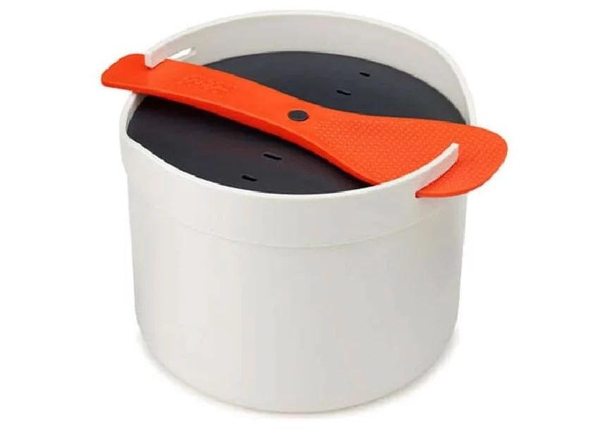 La vaporera para microondas de Joseph Joseph, disponible en Amazon, es un set que incluye todo lo necesario para preparar arroz y granos sin complicaciones. Su diseño funcional incorpora una olla de cocina con capacidad de 2 litros, un colador, una taza medidora y una paleta multiusos. Este último elemento no solo permite mezclar y servir el arroz, sino que también sirve como cierre de la tapa, aportando una solución de transporte cómoda para trasladar el recipiente.