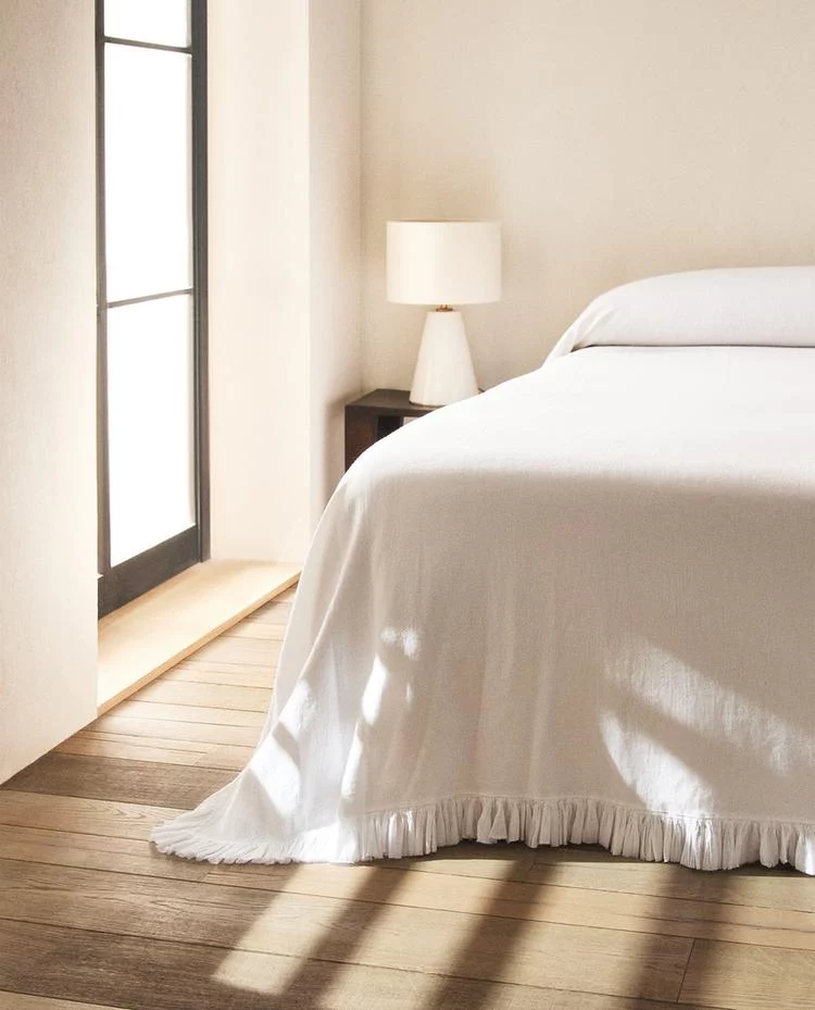 La primera en la que nos hemos fijado es esta delicada colcha de algodón con volante plisado por los bordes que puede ser perfecta para el otoño. Una colcha cómoda y elegante que nos puede resultar muy práctica para abrigarnos las noches de otoño y puede encontrar en tonos diferentes: blanco, verde o crudo.