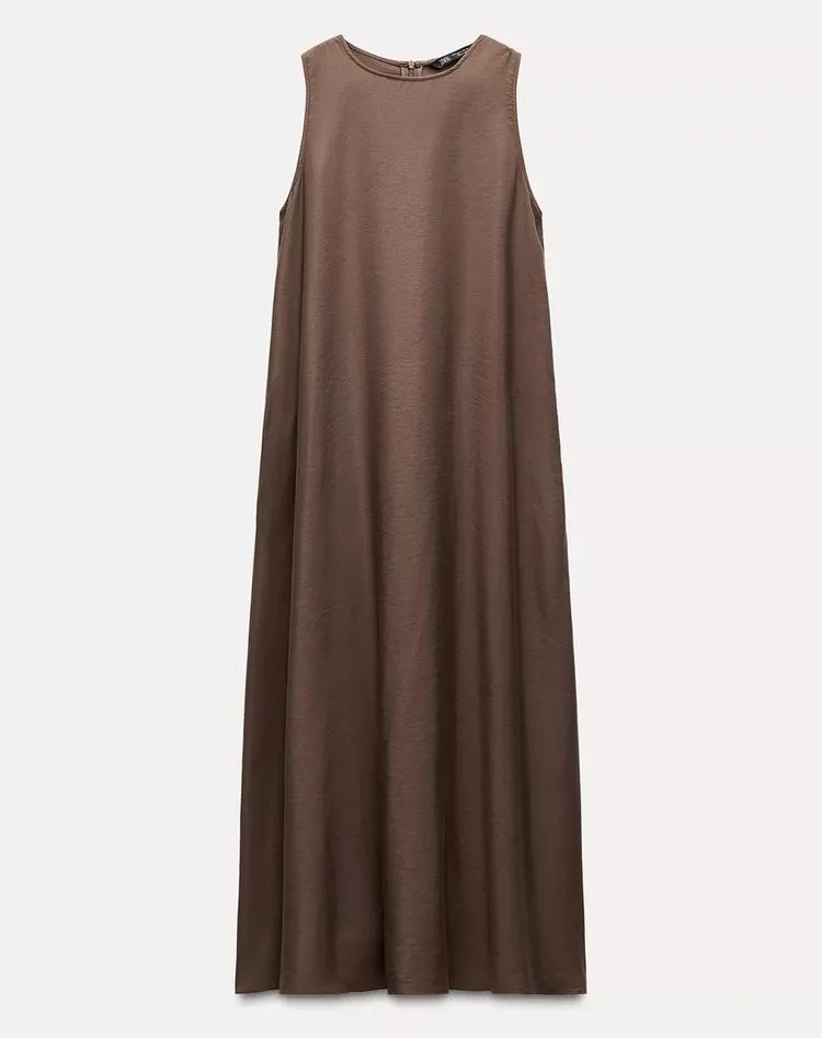 Si lo tuyo es más lo cómodo y relajado, este vestido es perfecto para ti. Con un precio de 35,95 euros, este vestido fluido de cuello redondo y manga sisa es la prenda perfecta para esos días en los que quieres sentirte libre y cómoda sin perder el estilo. Lo puedes encontrar en color chocolate, y tiene un toque práctico en su diseño, ya que cuenta con bolsillos laterales ocultos en la costura. Este tipo de vestido es perfecto para combinar con un cinturón ancho que defina la cintura, o llevarlo sin complementos para un look más relajado y bohemio. Además, su color chocolate lo hace ideal para el otoño, ya que se integra perfectamente con los tonos cálidos y terrosos de la temporada. Puedes combinarlo con unos botines y una chaqueta de punto grueso, y estarás lista para cualquier plan otoñal.