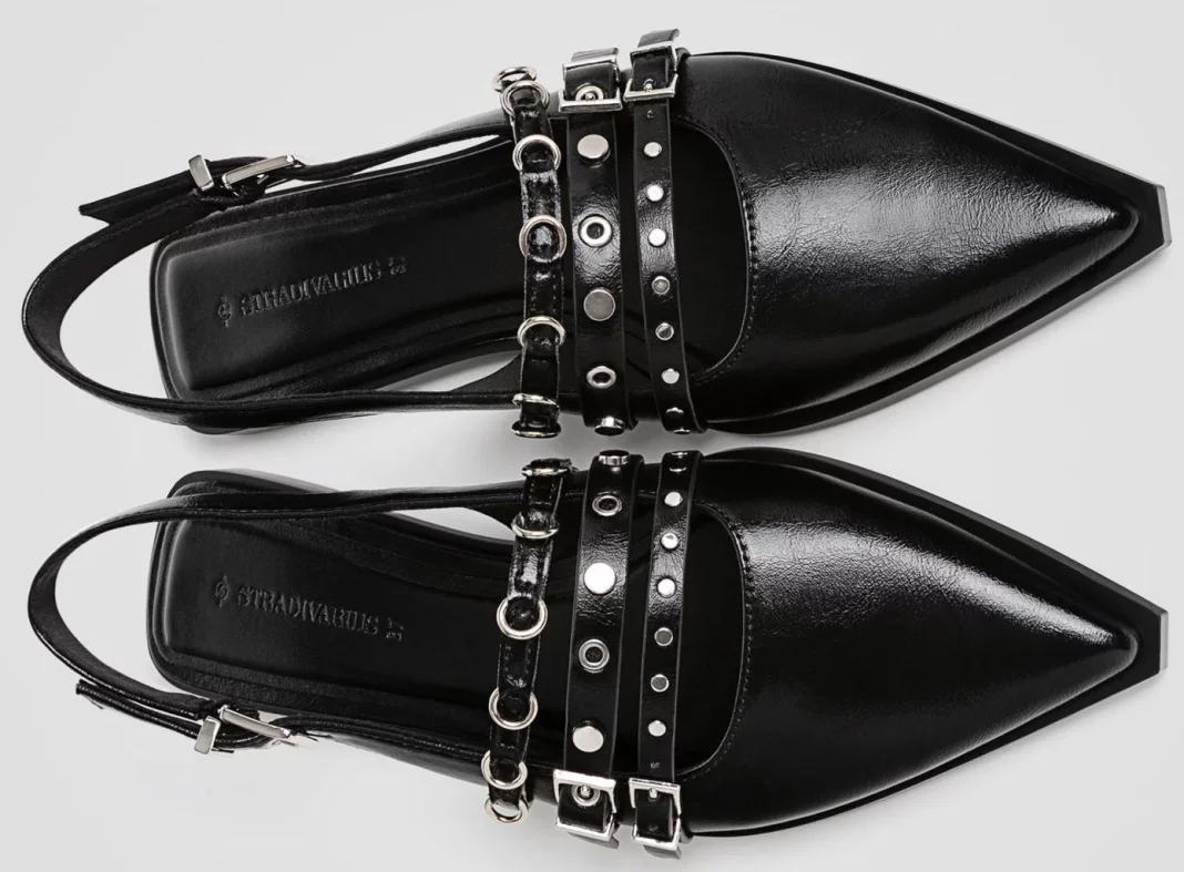 Los zapatos planos tiras hebillas de Stradivarius, los podrás encontrar por 29,99 euros, y son una opción versátil con muchos detalles interesantes. Su diseño destalonado, acabado en punta y cierre lateral con hebilla los convierte en un calzado único que combina comodidad y estilo. Además, las tiras con tachas le dan un toque atrevido y moderno que los hace destacar.