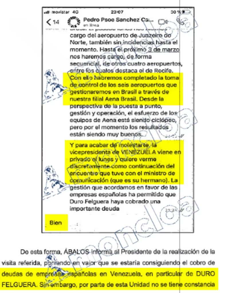 La UCO explica al juez que la carta estaba en el ordenador incautado a Aldama y «muestra cómo Aldama se habría valido de las más altas instancias del MITMA para organizar este viaje. Con fecha 16 de enero de 2020 en una conversación entre Koldo y Ábalos, este último le remite una captura de pantalla en la cual, el ex ministro se ponía en contacto con el Presidente del Gobierno. De esa forma, Ábalos informa al Presidente de la realización de la visita referida, poniendo en valor que se estaría consiguiendo el cobro de deudas de empresas españolas en Venezuela, en particular de Duro Felguera. Sin embargo, por parte de esta unidad no se tiene constancia del cobro de ninguna deuda por parte de Duro Felguera en aquella fechas».