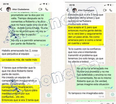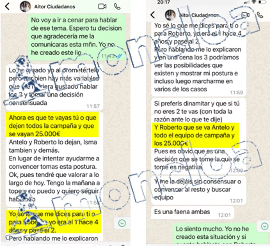 «Ahora es que te vayas tú o que dejen todos la campaña y que se vayan 25.000 euros. Antelo y Roberto lo dejan, Isma también y demás. En lugar de intentar ayudarme a convencer tomas esta postura. OK, pues tendré que valorar a lo largo de hoy -18 de abril de 2023-. Tengo la mañana a tope y no puedo y quiero seguir hablando», remarcó en el mensaje enviado apenas un mes antes de las elecciones y cerca de la fecha límite para presentar las candidaturas.
