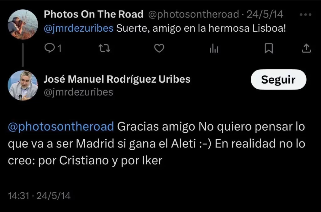 Esta última circunstancia ha acabado hacer saltar las alarmas en el entorno atlético que ha sacado vario tweets de Uribes en los que sale aflorar el madridismo y la imparcialidad de los hechos. En esos tweets en la red social X se ven declaraciones tales como «no quiero lo que va a ser Madrid si gana el ‘Aleti'» en referencia ala final de Champions 2014. En este sentido, también aparece otro tweet junto a Emilio Butragueño, miembro de la directiva del Real Madrid.