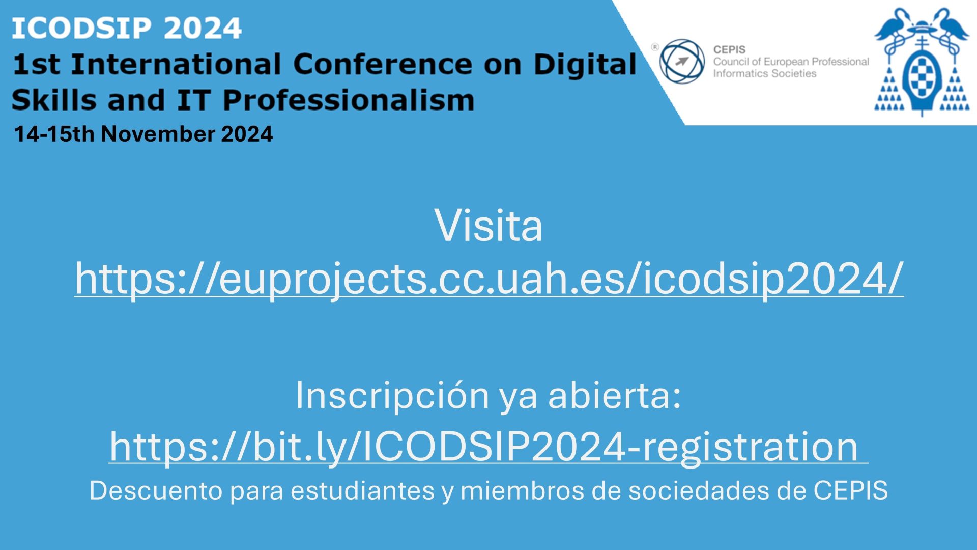 Co-organizada por el Consejo de Sociedades Profesionales de Informática Europeas (CEPIS) que representa a 28 países del continente, su representante española Asociación de Técnicos de Informática y la Universidad de Alcalá, acogerá los días 14 y 15 de noviembre de 2024, en Alcalá de Henares, a decenas de expertos de todo el continente para presentar estudios, investigaciones y presentaciones de proyectos. La International COnference on Digital Skills and IT Professionalism (ICODSIP) es la primera conferencia centrada en dos temas de absoluta necesidad: por una parte, el desarrollo de las competencias digitales en toda la ciudadanía y en los profesionales no tecnológicas para poder beneficiarse de la digitalización; por otra, el reto de contar con suficientes profesionales especialistas en tecnologías de la información (TI), en línea con el objetivo de la Comisión Europea de 20 millones de ellos en el continente en 2030.