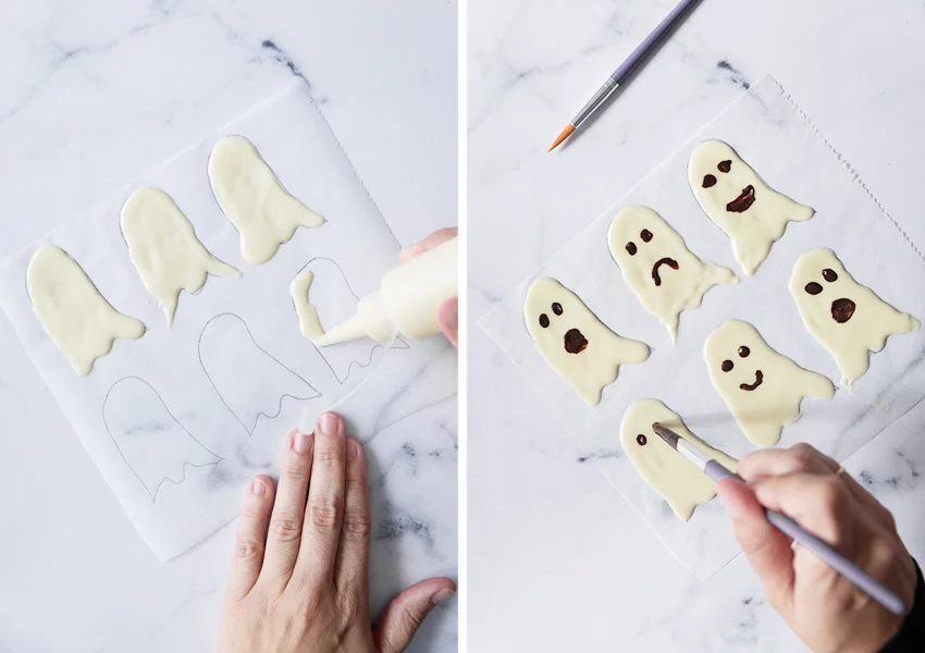 Una vez que los fantasmas estén firmes, pasamos a la parte más divertida: la decoración. Derrite un poco de chocolate negro o con leche, dependiendo de tus preferencias, hasta que tenga una consistencia suave y fluida. Luego, utiliza un palillo o una pequeña bolsa de plástico con una esquina cortada para dar forma a los ojos y la boca de nuestros fantasmas. La combinación del yogur y el chocolate proporcionará un delicioso contraste de sabores.