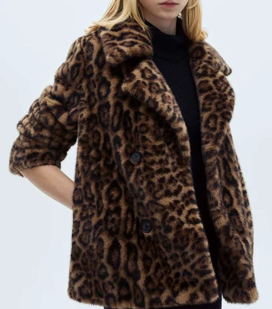 No podemos pasar por alto este abrigo de leopardo, que ha sido un auténtico éxito esta temporada. Este abrigo corto, confeccionado con un tejido sintético de estilo peluche, es cálido y elegante, convirtiéndose en un elemento imprescindible para quienes desean destacar. Su diseño cuenta con un cuello con solapa y dos bolsillos laterales, lo que lo hace tanto atractivo como funcional.