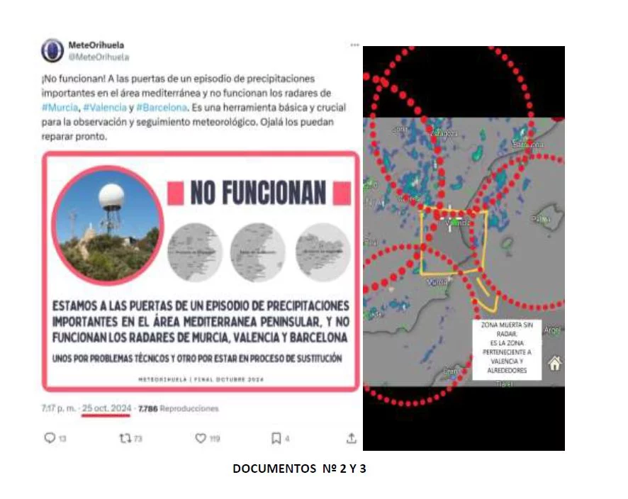 Por eso la denuncia de Manos Limpias presentada el 31 de octubre incluye el testimonio de Palleter: «El radar de Valencia, según la AEMET, estaba funcionando desde la mañana del día 28 de octubre. El agricultor Juanvi Palleter denunció el jueves 25 de octubre que los radares de la AEMET no funcionaban» y presentaron como prueba dos documentos numerados como 2 y 3.