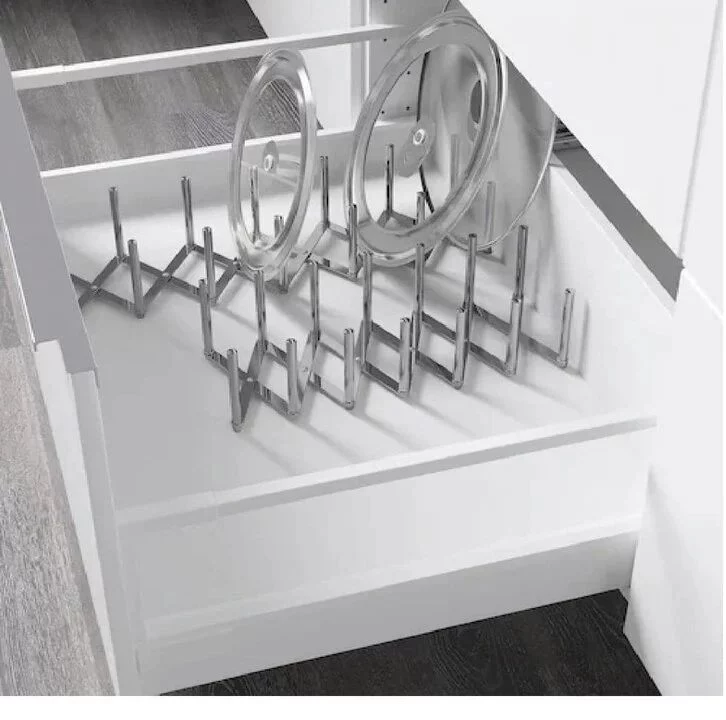 Este soporte no tiene mayores limitaciones ya que su cuerpo es extensible y permite ajustarlo a diferentes tamaños de tapas, ofreciendo máxima versatilidad. Con medidas que van desde 8,5 cm de longitud mínima hasta 50 cm de longitud máxima, 14,5 cm de ancho y 10 cm de alto, este soporte se adapta tanto a armarios como a cajones. Además, su diseño cromado aporta un toque elegante al espacio, mientras que su precio de 9,99 € lo hace accesible para todos.