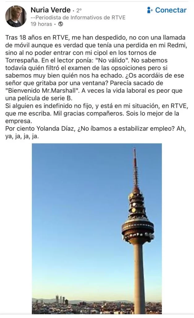 El caso que reaviva este eterno problema en la Corporación Pública es el despido de la periodista Nuria Verde. La periodistas del área de informativos de la cadena estatal ha anunciado su despido en redes sociales con un texto que relata su situación. Así se enteró Verde de su despido: «Tras 18 años en RTVE, me han despedido, no con una llamada de móvil, aunque es verdad que tenía una perdida en mi Redmi, sino al no poder entrar con mi cipol en los tornos de Torrespaña. En el lector ponía: ‘No valido'».