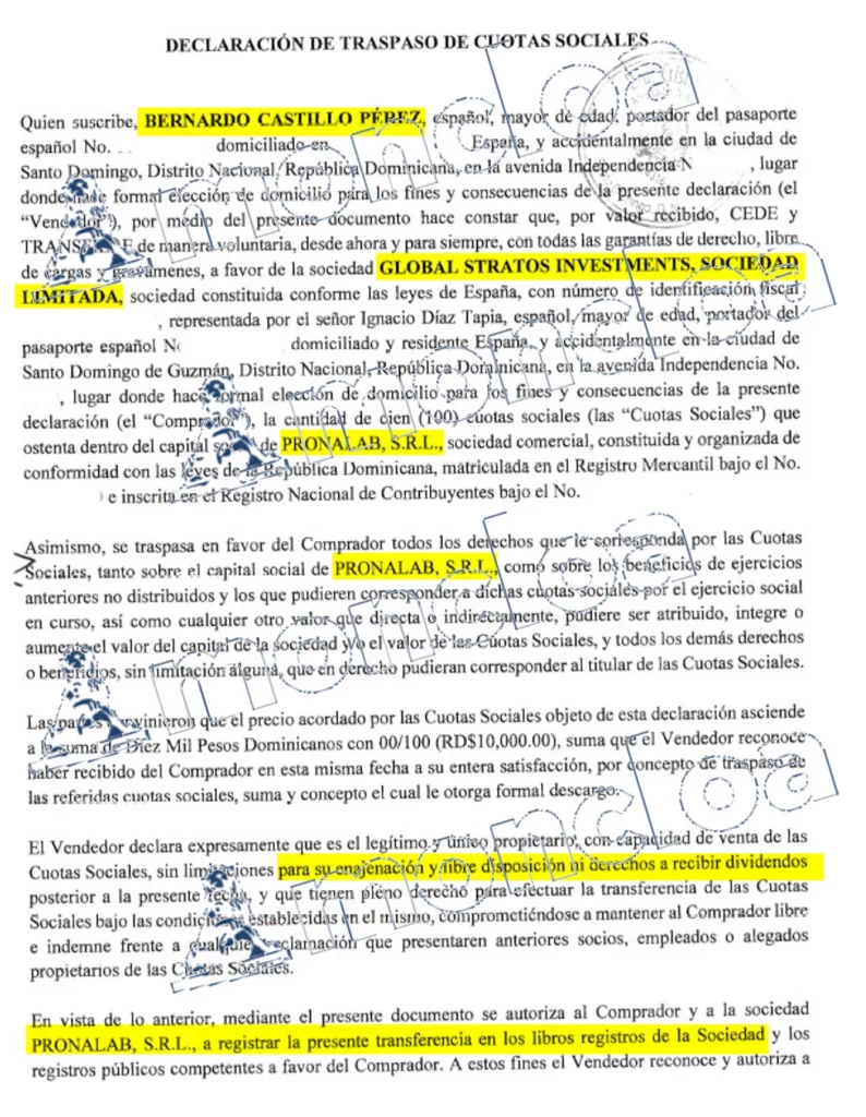Bernardo Castillo vendió su participación en Pronalab por 10.000 pesos dominicanos, unos 157 euros y además se obligaba en su condición de vendedor «a no involucrarse o tener participación o interés, directa o indirectamente, individual, conjuntamente o a través de terceras personas, en el desarrollo de negocios similares al negocio de Pronalab SRL, que estén localizados dentro del territorio de la República Dominicana por un período de cinco (5) años que le sigan a la transferencia de las cuotas sociales (acciones)». En el mismo acto Castillo Pérez renunciaba por carta a su cargo de gerente dentro de la compañía.