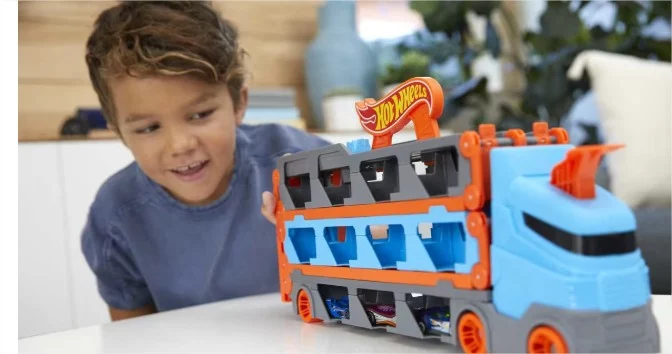 El camión de transporte de Hot Wheels es el regalo perfecto para los pequeños amantes de los coches. Este juguete no solo funciona como un práctico camión de transporte, sino que se convierte en una emocionante pista para competir con los coches de juguete.