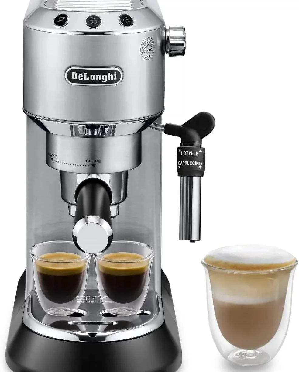 Para aquellos que prefieren una opción más compacta pero igualmente eficiente, Amazon también ofrece la De’Longhi Dedica Cafetera de Bomba de Acero Inoxidable. Inspirada en los clásicos diseños italianos, esta cafetera combina tecnología moderna con un estilo sofisticado en color metalizado. Con una presión de 15 bares y un sistema de calentamiento rápido que alcanza la temperatura óptima en solo 35 segundos, permite preparar espressos perfectos en cuestión de minutos.