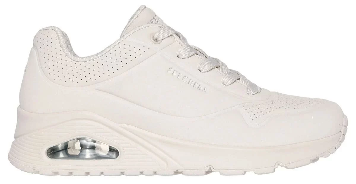 Las Skechers Uno – Stand On Air no solo han sobresalido por su diseño, sino también por sus características técnicas. Con una puntera redonda, caña baja acolchada y orificios de aireación estratégicamente ubicados, estas zapatillas aseguran comodidad y ventilación durante todo el día. Además, su sistema de ajuste con agujetas planas y refuerzos metálicos en los ojales garantiza una sujeción perfecta.