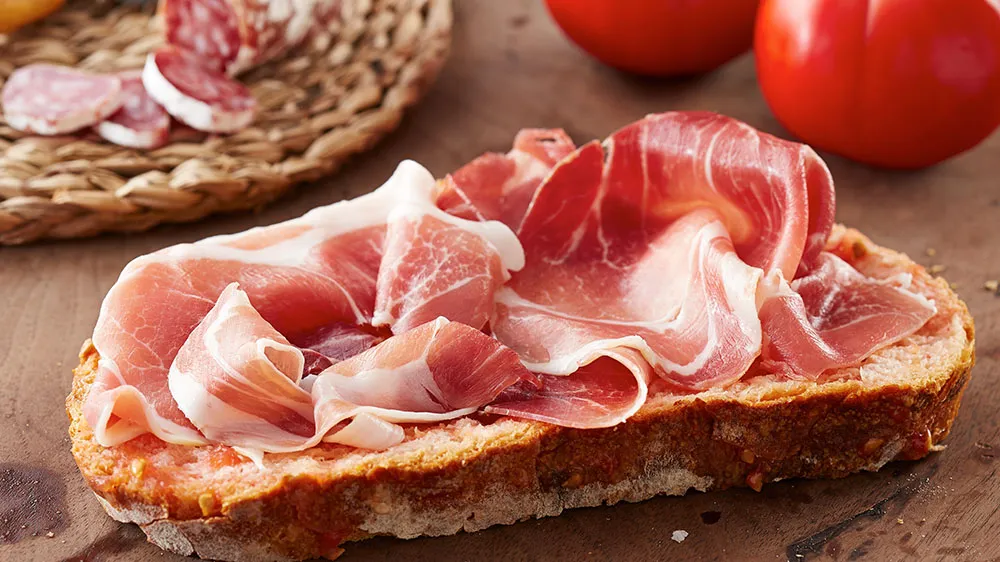 Para culminar la creación de nuestros canapés ligeros, añade con delicadeza unas rodajas de jamón serrano sobre la vinagreta, asegurándote de que cada bocado incluya un poco de este delicioso embutido. El jamón serrano no solo añade un elemento salado y keto, sino que también proporciona un contraste perfecto con la frescura de la vinagreta y la base de pan crujiente. La combinación de colores, texturas y sabores resulta en un canapé vistoso y muy apetecible para nuestros invitados.