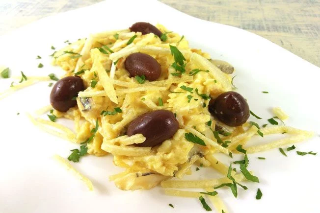 El momento clave del bacalao a bras llega al agregar los huevos batidos. Estos deben mezclarse rápidamente con el resto de los ingredientes, cocinándose a fuego bajo para evitar que se cuajen demasiado y mantengan su textura cremosa. Este equilibrio entre lo crujiente de las patatas y la suavidad de los huevos es lo que hace único a este plato. Un toque final de perejil fresco y unas aceitunas negras completan la presentación, aportando color y un sabor adicional que eleva la receta.