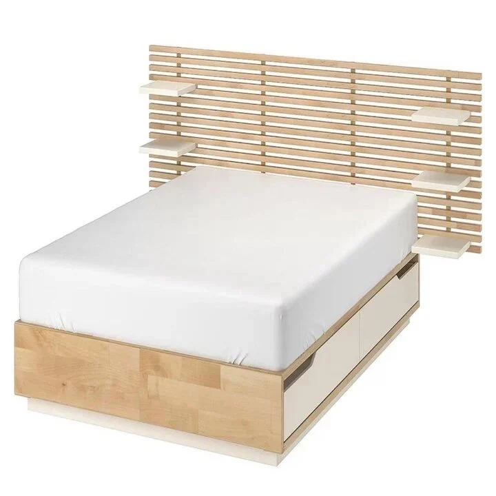 El cabecero, con su diseño rústico de madera de abedul, le da calidez al dormitorio, mientras que su funcionalidad permite colocar pequeños objetos decorativos o libros. Este detalle lo hace destacar entre las opciones habituales del mercado. Además, su tamaño, compatible con colchones de 200 x 160 cm, lo hace perfecto para dormitorios principales en pisos pequeños donde el espacio es limitado. En IKEA, incluso los herrajes necesarios para fijarlo a la pared están disponibles, lo que facilita su instalación.