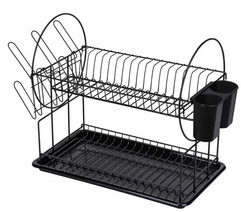 Este innovador escurreplatos cuenta con un cuerpo rectangular de dos niveles, lo que amplía su capacidad de almacenamiento. Incluye dos cestos laterales para organizar la cubertería y unos ganchos en el lado opuesto para colgar tazas o vasos. Para mayor comodidad, posee de una bandeja de plástico en la base que recoge el agua sobrante, manteniendo la cocina limpia y libre de humedad.