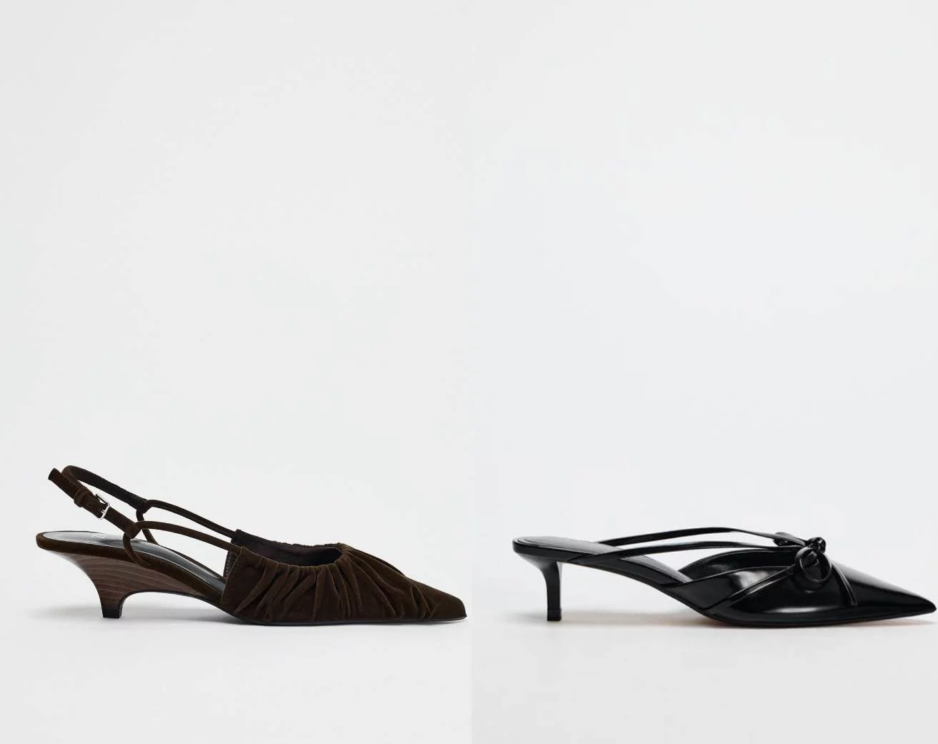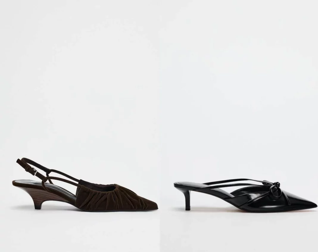 Aunque no es exactamente igual, en la tienda de Inditex se puede encontrar zapatos muy similares pero en la versión «destalonada». En este caso, el modelo perfecto para lucir con vestidos corte midi es el «destalonado fruncido efecto terciopelo», que se pueden encontrar a 39.95 euros. Este modelo se vende en color marrón y la altura del taco es de 4.5 centímetros. El llamado tacón kitten es el rey de los trends de este invierno y, además de esta variante, existe otra que va muy bien con los vestidos antes mencionados. Uno de ellos es el zapato de efecto de estampado animal y acabado en punta que se puede encontrar a 29.95.