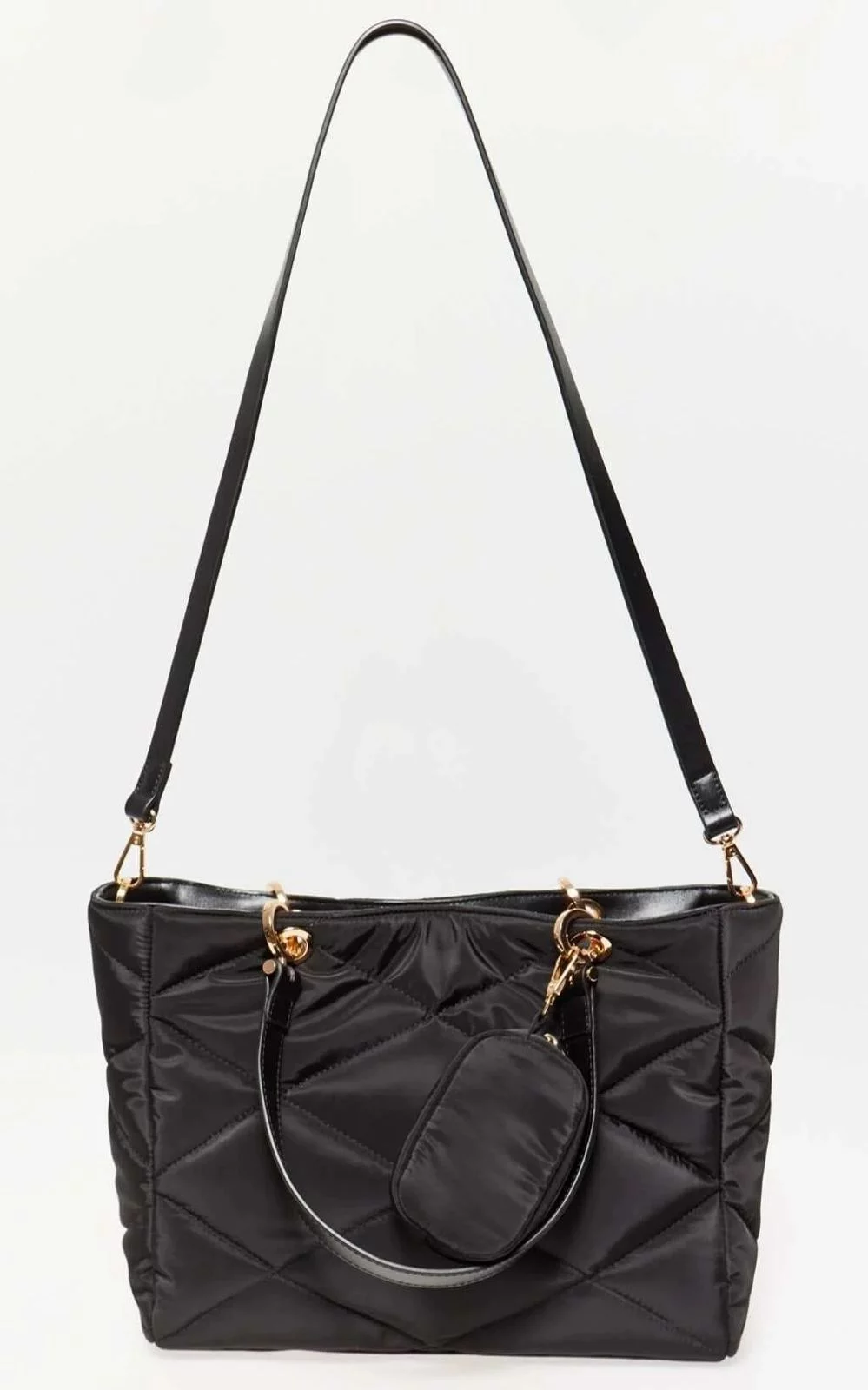 Otra propuesta que ha destacado de Sfera es el bolso glossy, un diseño en color negro que combina elegancia y comodidad. Este modelo cuenta con un tamaño mediano, doble asa de mano y una correa tipo bandolera ajustable, lo que lo hace perfecto para quienes necesitan un bolso versátil y práctico. Su exterior acolchado le otorga un aire sofisticado que encaja perfectamente con los outfits más modernos.