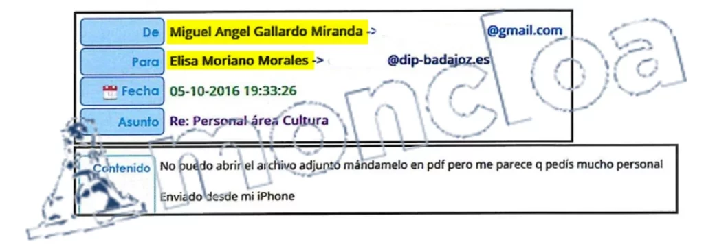Poco después, Moriano envió un correo a Miguel Ángel Gallardo, presidente de la Diputación con el asunto «Presupuestos 2017″. Sobre este asunto, la UCO recoge en su informe que «como adjunto a este correo, existe un documento con los presupuestos del año 2017 en comparación con los del año 2016, no apreciándose ningún aumento de presupuesto en el apartado correspondiente a la promoción cultural ni en los correspondientes a los dos conservatorios de música».