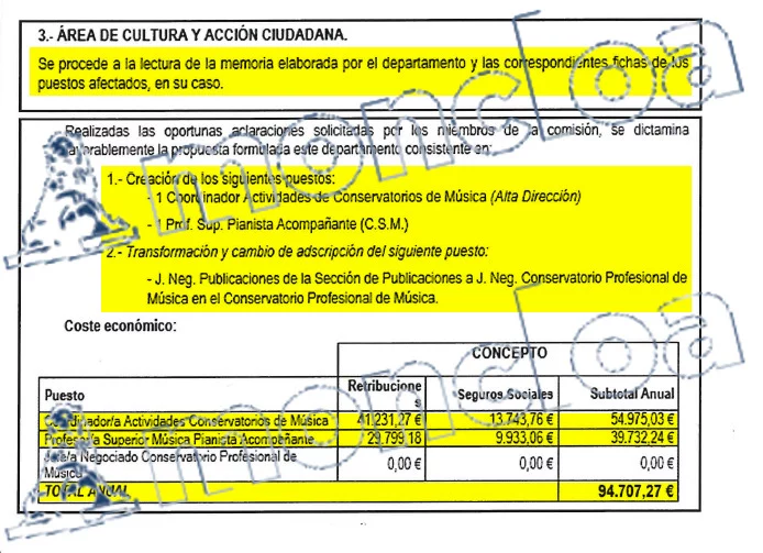 De hecho, tras uno de los mails de Moriano a Gallardo, el presidente de la Diputación le contestaba el 5 de octubre de 2016 que «»….me parece que pedís mucho personal», donde expresa que las necesidades de personal serían, a su parecer, excesivas». Sin embargo, el presupuesto sí concretaba la creación de un puesto de «gerente» con un sueldo de 60 mil euros, que no sería el que ocuparía después David Sánchez. Este puesto fue consignado como «Nuevo jefe de Servicio o Gerente Conservatorios». El 10 de octubre se intercambiaron varios correos entre funcionarios justificando el aumento en el presupuesto para 2017 de 123.000 euros, detallando que se debería a la creación de un «Nuevo Jefe de Servicio o Gerente Conservatorios», que no era definitivamente el puesto que ocuparía David Sánchez, pero ya era similar.