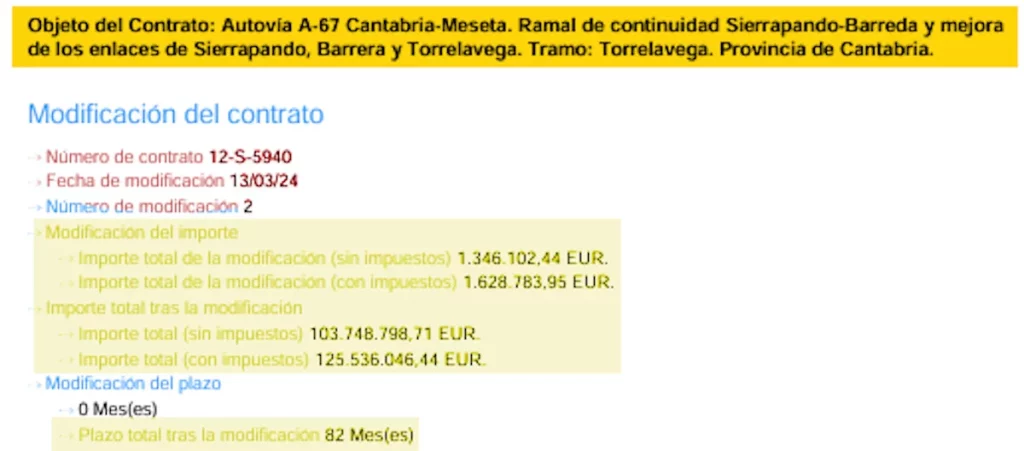 En concreto, estos cambios conllevaron un sobrecoste de 7,657 millones de euros sobre el importe inicialmente adjudicado, hasta los 97,78 millones de euros sin contabilizar los impuestos, o bien los 118,314 millones de euros sumando los tributos correspondientes, con un aumento de los costes de 9,266 millones de euros. En total, una subida del 7%. La modificación se subió a la plataforma pública a las 12.31 horas del 7 de abril de 2022. Apenas 40 minutos después, a las 13.11 horas, se anuló dicha subida.