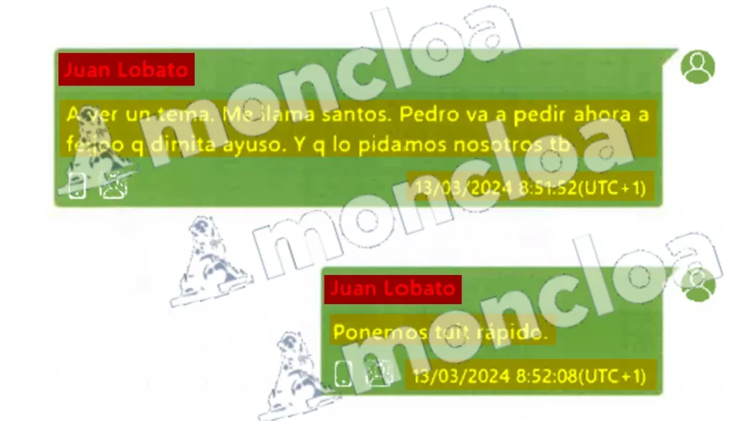 A las 8.43 horas del 13 de marzo y antes de que ningún medio publicara íntegro el mensaje, Santos Cerdán envió a Lobato un mensaje contundente y escueto: «Buenos días, llámame». Además de tratar sobre la petición de dimisión por parte del Presidente del Gobierno, también en la conversación el secretario de Organización del PSOE le señala «pero no te quedes en si lo sabía, hay que pedir la dimisión […] Tiene que salir todo el PSM pidiendo la dimisión de Ayuso».
