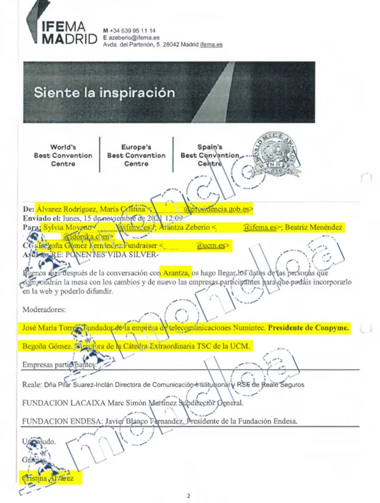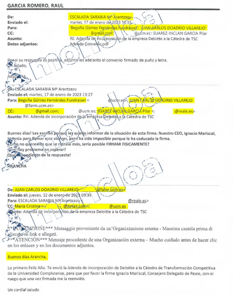 En otro correo recogido en el sumario, se refleja que Álvarez también trasladó a Reale el interés de Begoña Gómez en que la empresa aseguradora siguiera patrocinando la Cátedra de Transformación Social Competitiva (TSC) que dirigía. En enero de 2023 los correos de Reale a Álvarez recogen la disponibilidad para firmar una adenda que se incorporó a la cátedra que dirigía Gómez. Al mismo tiempo también la empresa Deloitte también se interesaba por formar parte de esa cátedra. Álvarez también organizaba los ponentes de conferencias en Ifema, como los de «Vida Silver», en la que participaron Endesa, la Fundación La Caixa y Reale Seguros.