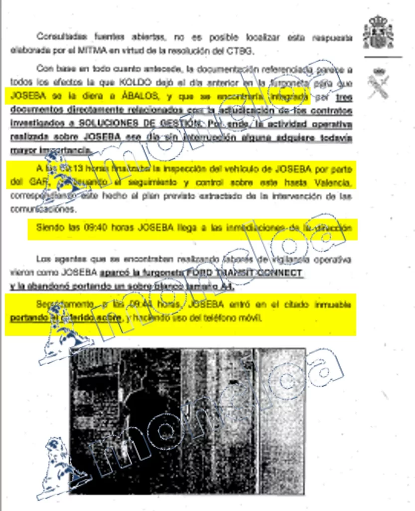 Siguiendo el relato de los hechos, «en el trayecto desde la ciudad de Alicante hasta Valencia (…) el Grupo de Acción Rápida (GAR) de la Guardia Civil llevaron a cabo un control sobre el vehículo de Joseba, se procedio a inspeccionarlo y localizaron un sobre, el que había sido entregado por el Subsecretario, el cual iba nominado en la parte delantera del mismo a mi nombre, José Luis Ábalos Meco, y en el anverso estaba cerrado y con el sello oficial del MITMA».