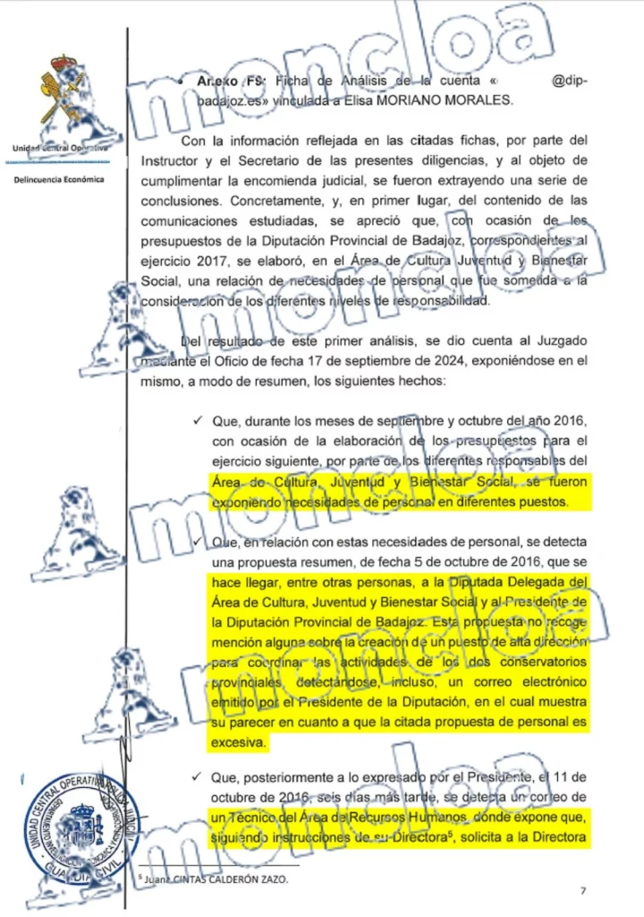 La UCO añadía que «en relación a estas necesidades de personal se detecta una propuesta resumen, de fecha 5 de octubre de 2016, que se hace llegar (…). Esta propuesta no recoge mención alguna sobre la creación de un puesto de alta dirección para coordinar las actividades de los dos conservatorios provinciales, detectándose incluso un correo electrónico emitido por el presidente de la Diputación, en el cual muestra su parecer en cuanto a que la citada propuesta de personal es excesiva». Ese correo resumen de puestos de puestos de trabajo fue enviado por la jefa del Área de Cultura hasta 2019, Elisa Moriano, que está llamada a declarar como imputada el próximo 9 de enero.