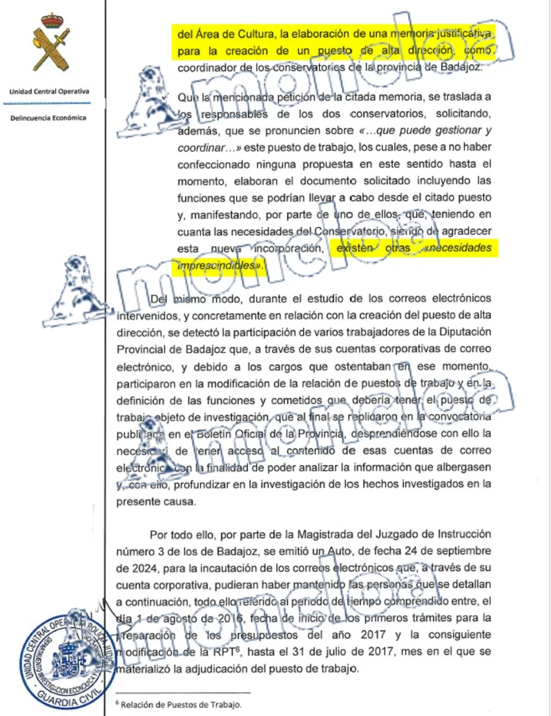 La juez Beatriz Biedma, titular del Juzgado de Instrucción 3 de Badajoz, coteja ya el intercambio de correos electrónicos entre los responsables del Área de Cultura, Juventud y Bienestar Social entre septiembre y octubre de 2016, donde al principio no se recogía la necesidad de la creación de un coordinador de los conservatorios de Badajoz, hasta la petición de la directora del Área de Recursos Humanos y Régimen Interior, Juana Cintas, para que se elaborase una memoria justificativa para la creación de un puesto de coordinador. Ese empleo fue el que pasó a ocupar en 2017 David Sánchez, hermano del presidente del Gobierno, ahora Jefe de la Oficina de Artes Escénicas de la Diputación de Badajoz.