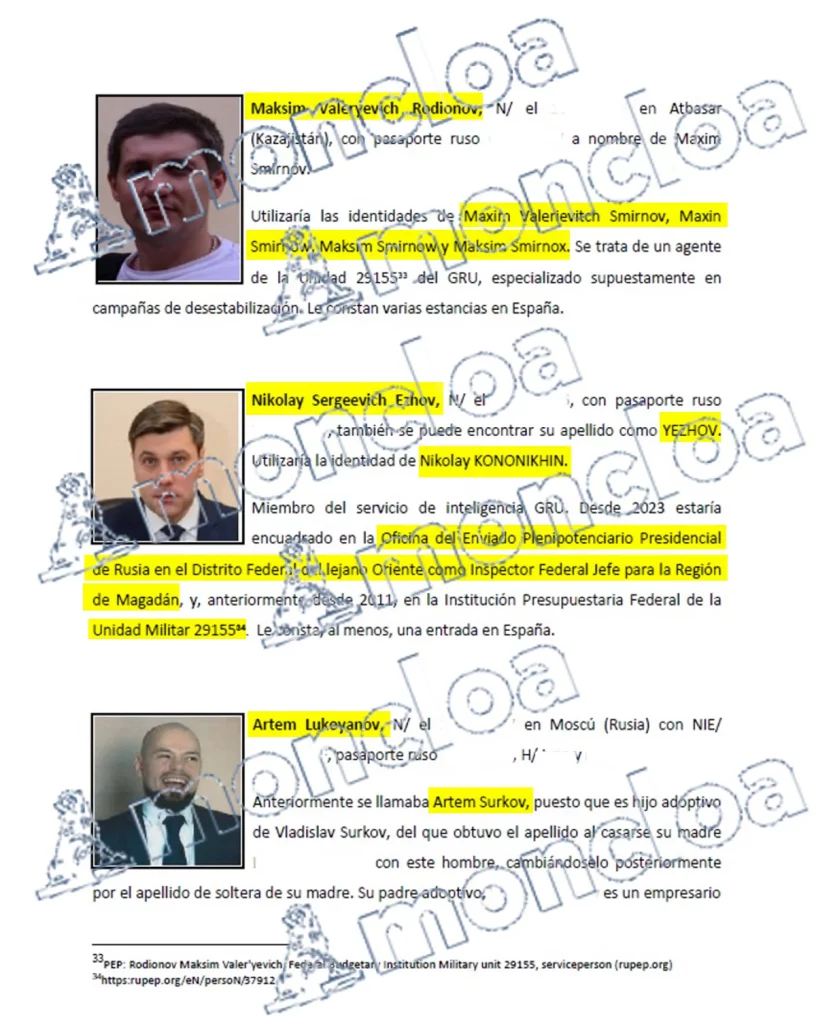 Maksim Valeryevich Rodionov, nacido en 1983 en Atbasar (Kazajstán), pero con pasaporte ruso como Maxim Smirnov. «Utilizaría las identidades de Maxim Valerievitch Smirnov, Maxin Smirnow, Maksim Smirnow y Maksim Smirnox. Se trata de un agente de la Unidad 29155 del GRU, especializado supuestamente en campañas de desestabilización. Le constan varias estancias en España», recoge el informe.