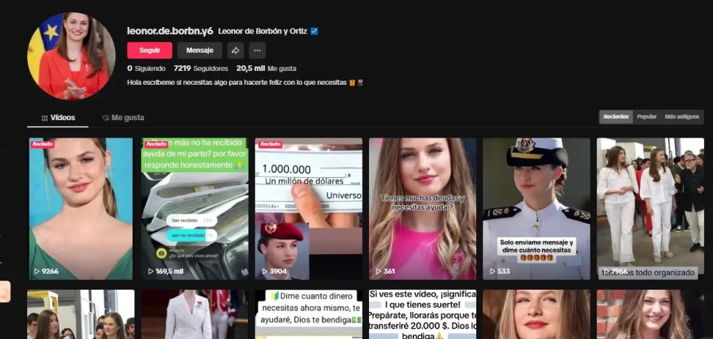 Un caso reciente que ha llamado la atención es la aparición de una cuenta fantasma en TikTok, supuestamente vinculada a Leonor, la Princesa de Asturias. Identificada como leonor.de.borbn.y6, esta cuenta ha acumulado cerca de 10,000 seguidores, lo que ha generado una creciente inquietud sobre la explotación de la imagen pública de la joven. La cuenta ha estado activa publicando videos que ofrecen dinero a cambio de datos personales, lo que aumenta las alarmas sobre posibles fraudes o intentos de phishing.