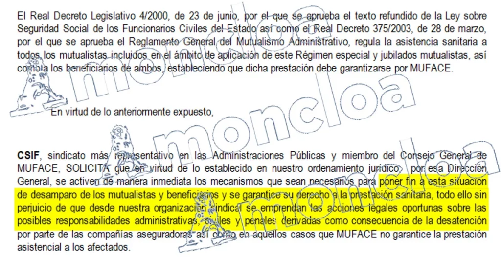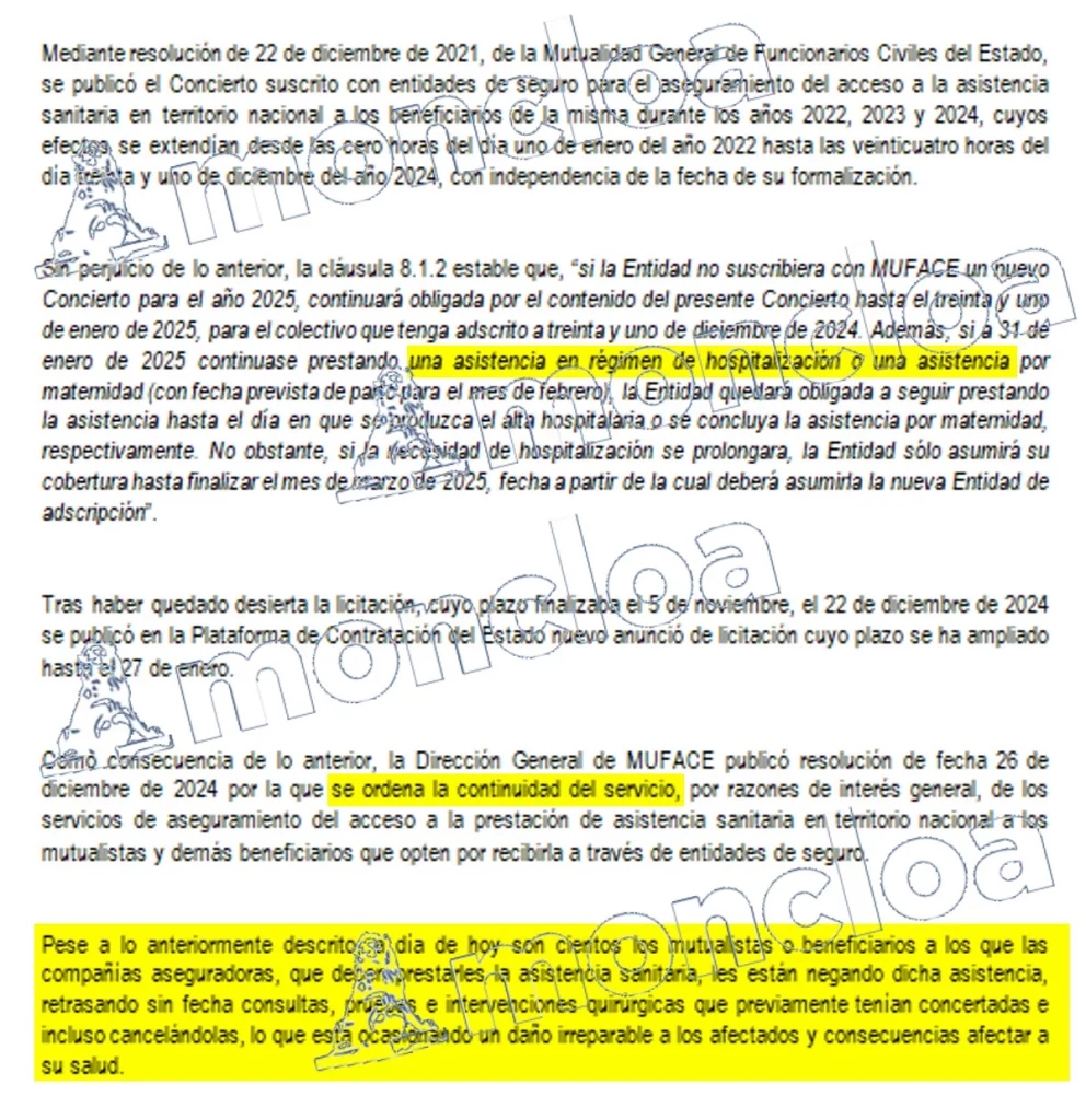 «Que como quiera que, a día de hoy continúa vigente el Concierto suscrito con entidades de seguro para el aseguramiento del acceso a la asistencia sanitaria en territorio nacional a los beneficiarios de la misma durante los años 2022, 2023 y 2024, publicado mediante la Resolución de 22 de diciembre de 2021, de la Mutualidad General de Funcionarios Civiles del Estado, por la que se publica dicho concierto y, por lo tanto, continua vigente la obligación de la prestación de los servicios a los asegurados beneficiarios de dicho aseguramiento y dada la gravedad que supone la falta de asistencia en materia de salud», afirma el escrito que envían los afectados a las aseguradoras de Muface correspondientes.