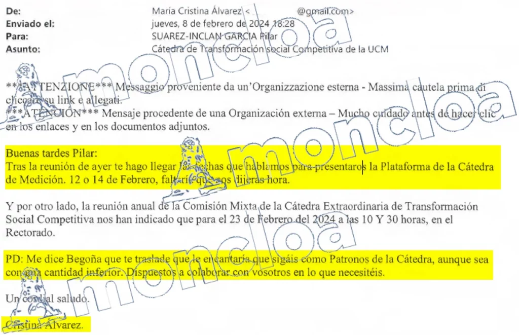 Además, aseguró que mantuvo conversaciones con el entonces vicerrector de la Complutense, Juan Carlos Doadrio, quien le trasladó comunicaciones para Begoña, aunque la coordinadora de la cátedra extraordinaria TSC era «Blanca». En este sentido se refiere a Blanca de Juan, directora de la Cátedra Extraordinaria de Transformación Social Competitiva, y cuyos correos también figuran en la causa, como el enviado a Begoña Gómez para el inicio de los nuevos estudios para el curso 2021/2022.