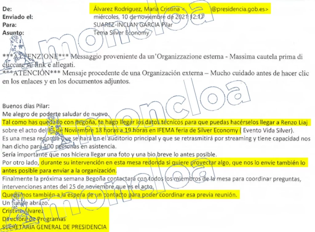 Cristina Álvarez también hacía uso del correo oficial de Presidencia de Begoña Gómez, una cuenta que utilizó «cuando tenía que gestionar la agenda de ella, las gestiones que tenía que hacer con terceras personas las hacía con el correo» de Presidencia.