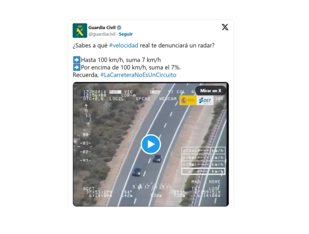 Mediante su canal oficial de X, la Guardia Civil reveló a qué velocidad real un radar puede denunciar. La entidad confirmó que existe la ya conocida «regla del 7» que es la que define el margen de error que detectan estos dispositivos y el límite que nunca deberá ser superado para evitar multas. Tal como confirman las autoridades, los radares permiten superar hasta 7 km/h, donde el límite inferior sea de 100 km/h.