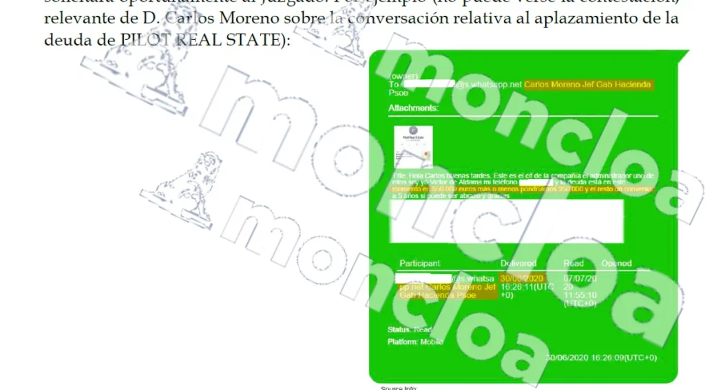 Asimismo, llama la atención que el propio Aldama pidiera acceder a sus iPhones intervenidos ya que «tras un primera análisis, aunque ya se dispone de datos relevantes, se aprecia que resultará necesario que se nos faciliten los terminales incautados para poder realizar nuevos volcados de parte, al haber apreciado, según informe de perito forense, que algunas de las contestaciones de whatsapp de miembros del Gobierno (no sucede lo mismo con otros interlocutores) aparecen con un mensaje de «el código de seguridad ha cambiado» que impiden acceder a su contenido (…)». Y ponía como ejemplo que «no puede verse la contestación relevante de D. Carlos Moreno sobre la conversación relativa al aplazamiento de la deuda de Pilot Real State».