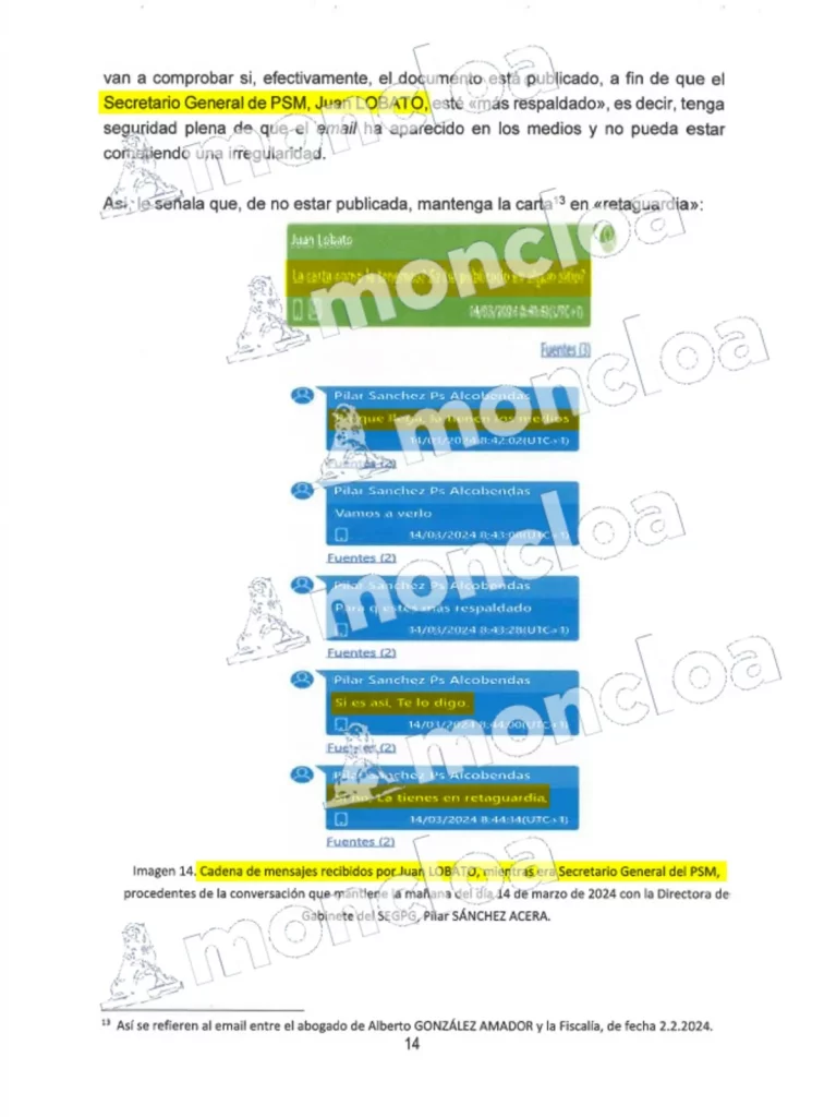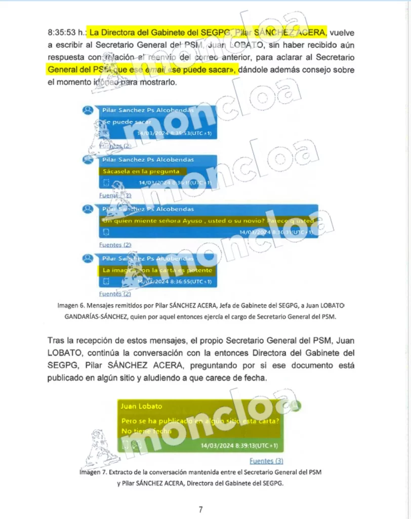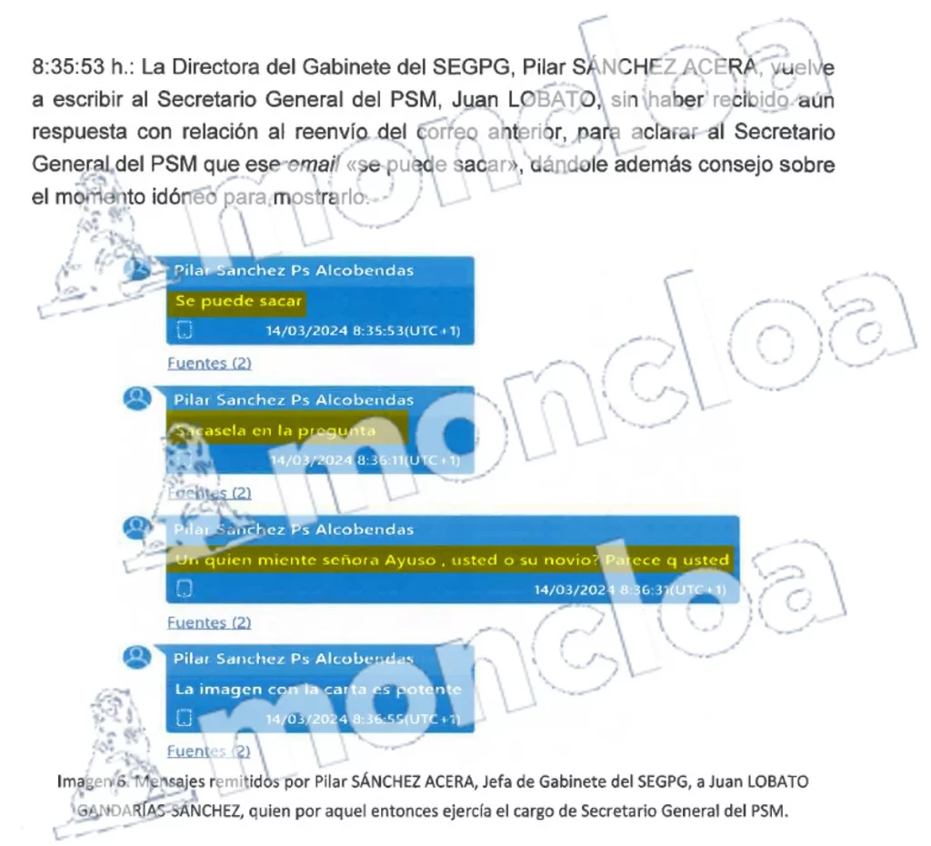 El primero de esos mails fue recibido por Lobato a las 7.03 horas de la mañana, procedente «del terminal móvil utilizado por la Directora del Gabinete del Secretario de Estado del Gabinete de la Presidencia del Gobierno, Pilar Sánchez Acera, consistiendo en varios tuits de la red social X» y además «durante los siguientes 20 minutos, en concreto hasta las 7.24.07 horas mantienen entre ambos una conversación vía whatsapp en relación con la línea a seguir sobre ese tema, en el Pleno de la Asamblea de Madrid al que asistirá el Secretario General del PSM, Juan Lobato, esa mañana».
