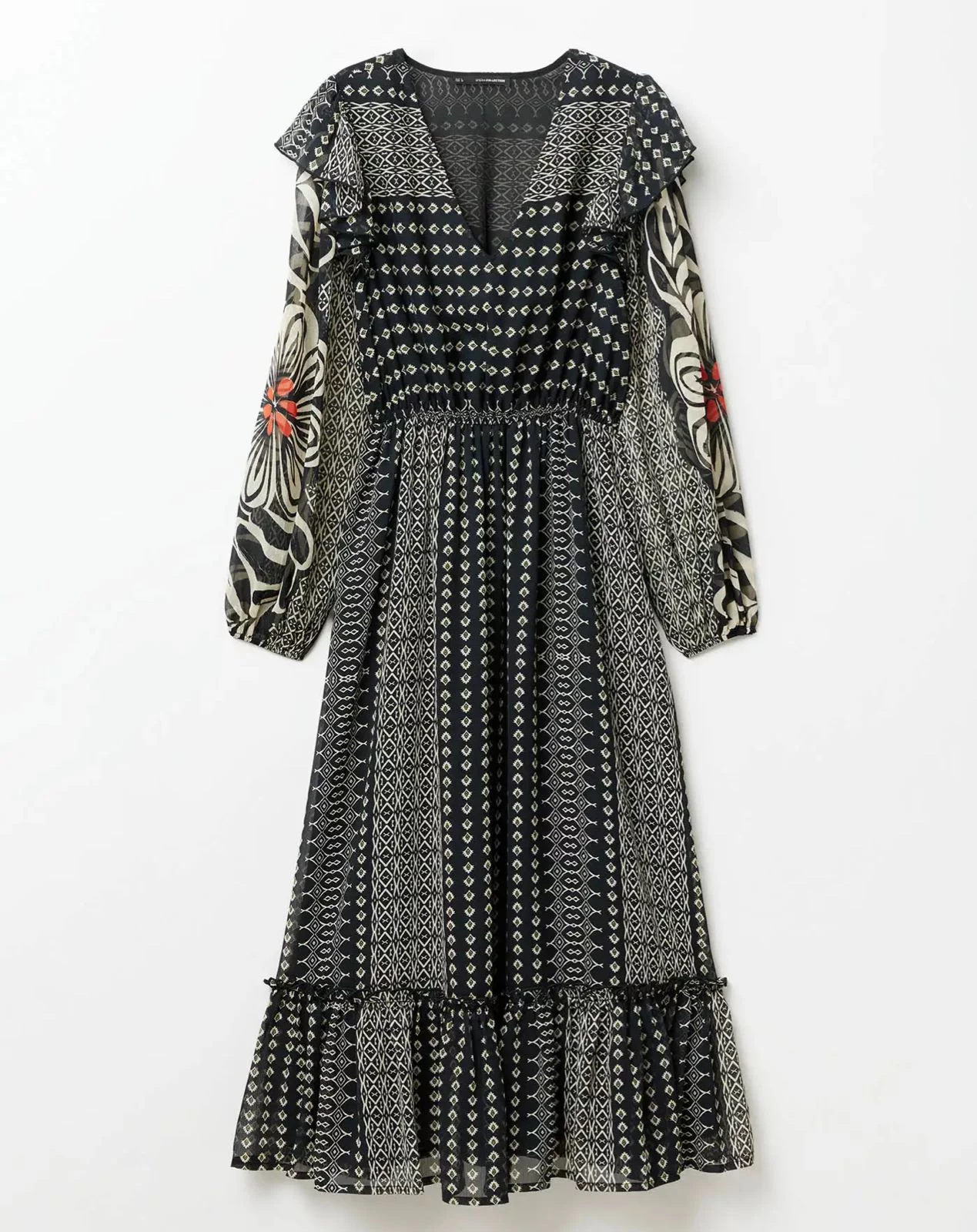 Sfera ha sabido captar al máximo la esencia de esa época pero en la moda actual. Este vestido, primero tiene en su estampado dos tonos que nunca fallan, blanco y negro, lo que actúa como parte de la base perfecta para lograr un equilibro y para no hacer ver un diseño tan pesado con el resto de estampado. Con esta prenda de Sfera no necesitarás muchos complementos, el vestido habla por sí solo y se lleva todo el protagonismo, además, cuesta únicamente 23,99 euros.