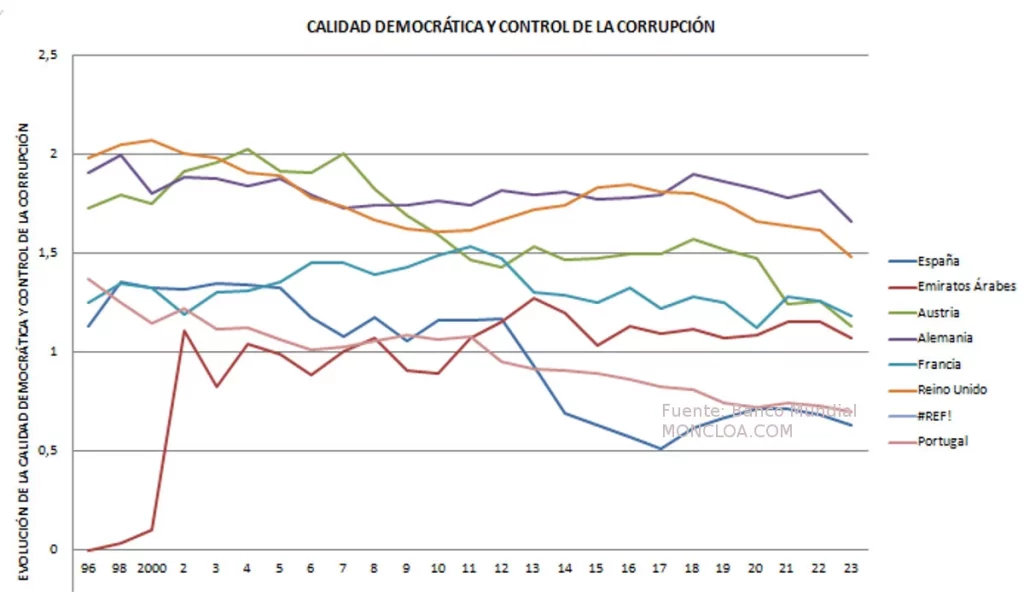 El estudio también muestra la evolución de estos indicadores de 266 países y zonas geográficas, incluyendo colonias de Francia, entre 1996 y 2023. El deterioro en España es relevante, al pasar de los puestos más altos a mostrarla tan solo por encima de Grecia en Europa y en mínimos históricos. De esta forma, se pone de manifiesto que los controles contra la corrupción brillan por su falta de eficacia. En este sentido, cabe destacar que España incumple las recomendaciones del GRECO y se mantiene en una evaluación en fase dos, un estudio que se oculta por orden del Ejecutivo, al ser publicados los de otros países.