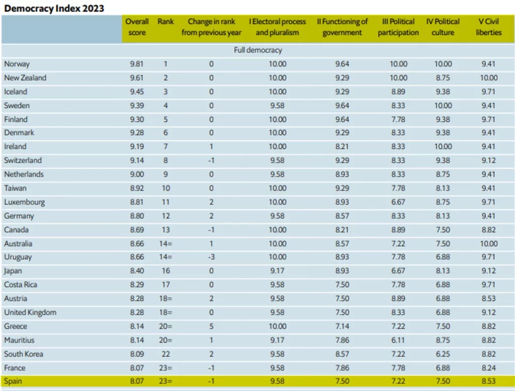 Con Pedro Sánchez en La Moncloa, España se debate ahora entre pertenecer al selecto grupo de una «democracia plena» o pasar a una «democracia defectuosa», según el último estudio publicado por The Economist. La prestigiosa revista ubicó a España en el último lugar de este grupo tras perder este galardón en 2022.