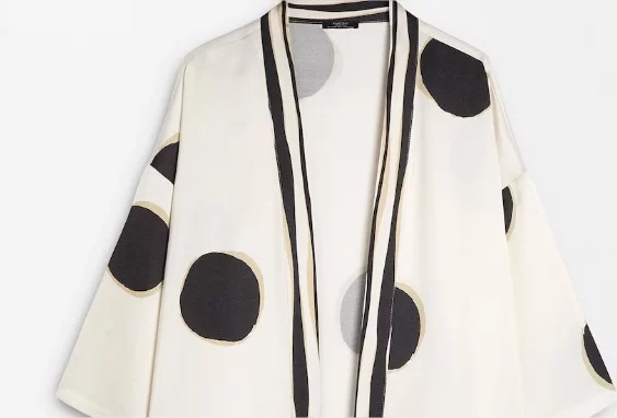 Si buscas una prenda versátil y sofisticada, este kimono oversize en blanco con estampado de lunares irregulares es ideal. Su caída fluida y su diseño amplio aportan un aire bohemio y elegante a cualquier conjunto.