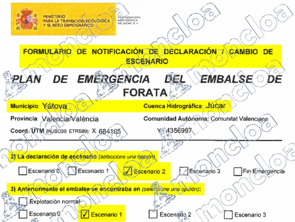 «A lo largo de la reunión del CECOPI, la CHJ comunicó que no se podía garantizar la estabilidad de la presa (de Forata) y que corría riesgo de pasar a situación 3». Este nivel de emergencia es el riesgo máximo e inminente colapso de la infraestructura crítica en menos de tres horas. La comunicación se realizó en la reunión del CECOPI, sobre las 17.00 horas, pero no fue hasta las 18.05 horas cuando se realizó la comunicación oficial y por escrito por parte de la CHJ, presidida por el desaparecido Miguel Polo, al Centro de Coordinación de Emergencias y otras entidades. En aquella comunicación se declaró el nivel 2 en la presa de Forata.