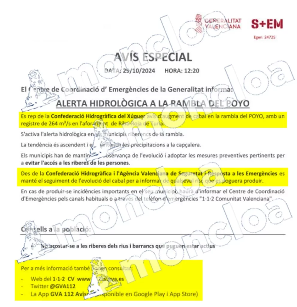 El citado informe comienza diciendo que «se recibe un aviso de la Confederación Hidrográfica del Júcar de un aumento del caudal en la Rambla del Poyo, con un registro de 264 metros cúbicos en el municipio de Riba-Roja de Turia». La alerta continúa diciendo que «se activa la alerta hidrológica en los municipios ribereños de la Rambla».