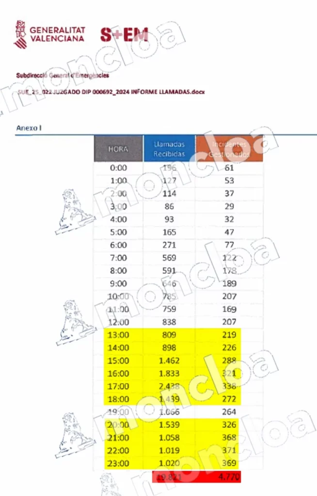La juez instructora había solicitado al teléfono de emergencias 112 que le informara a partir de qué momento de ese día se comenzaron a recibir llamadas sobre la DANA y de qué localidades procedían las mismas, por lo que se le ha enviado un informe de 100 páginas con el registro de las llamadas telefónicas. De las 19.821 llamadas los servicios de emergencia solo pudieron atender 4.770, por tanto, 15.000 llamadas quedaron sin respuesta.