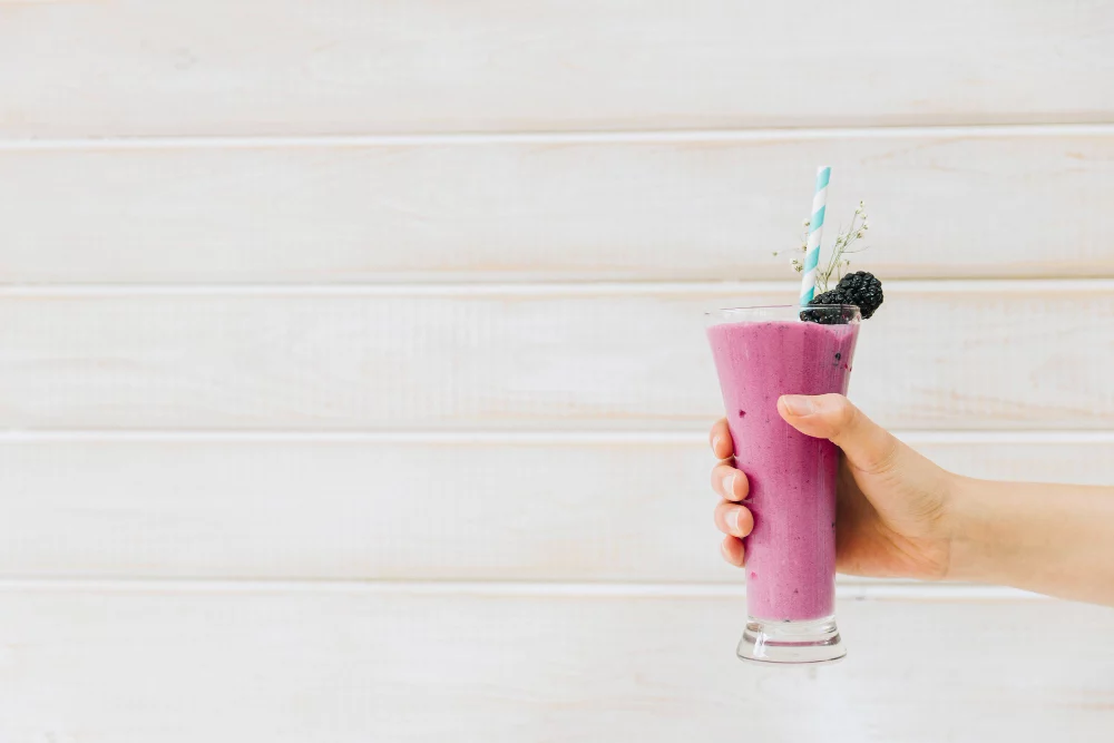 Sirve el cóctel en un vaso y decora con unos frutos rojos frescos, puedes disfrutar de esta deliciosa bebida en el desayuno, la merienda o como postre, siempre que lo consumas de forma regular para obtener los máximos beneficios para tu piel. Recuerda que el cóctel de colágeno «oro morado» es un complemento a una dieta equilibrada y un estilo de vida saludable, no un sustituto.