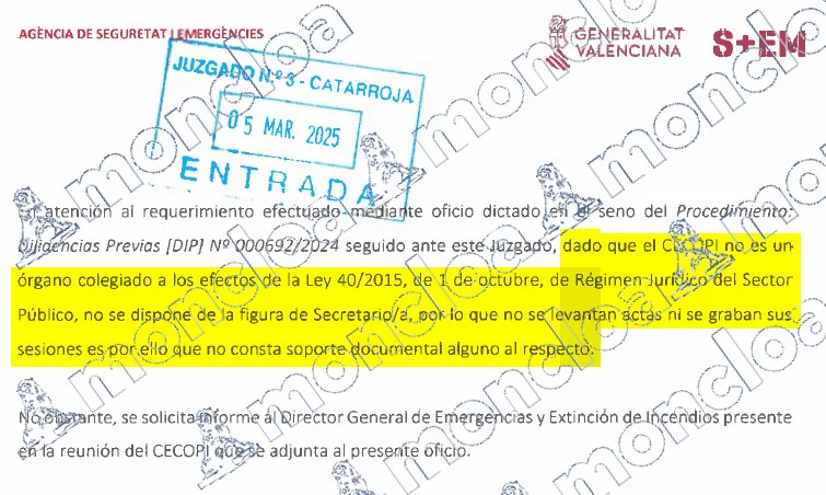 La titular del Juzgado de Primera Instancia e Instrucción número 3 de Catarroja preguntó al CECOPI, el centro de emergencias y protección de civil coordinado por la Generalitat, el Gobierno, la AEMET, la Confederación Hidrográfica del Júcar (CHJ) y Emergencias, entre otros organismos, las actas de las reuniones y las grabaciones.