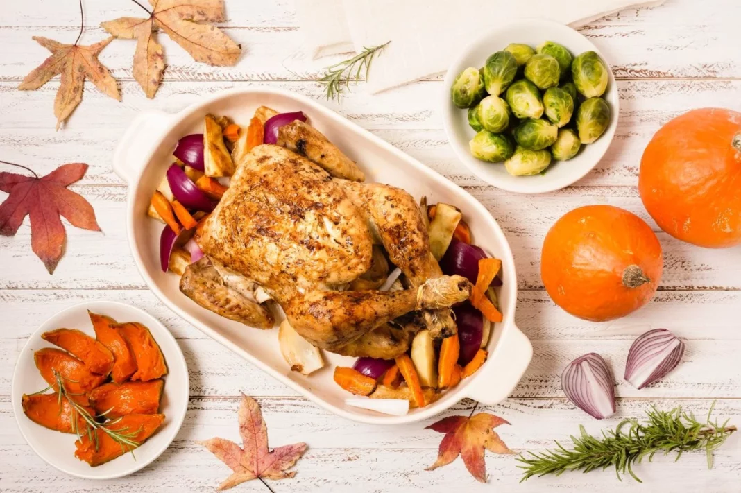 1Ingredientes para un pollo al horno con verduras, manzana y salsa de mandarina